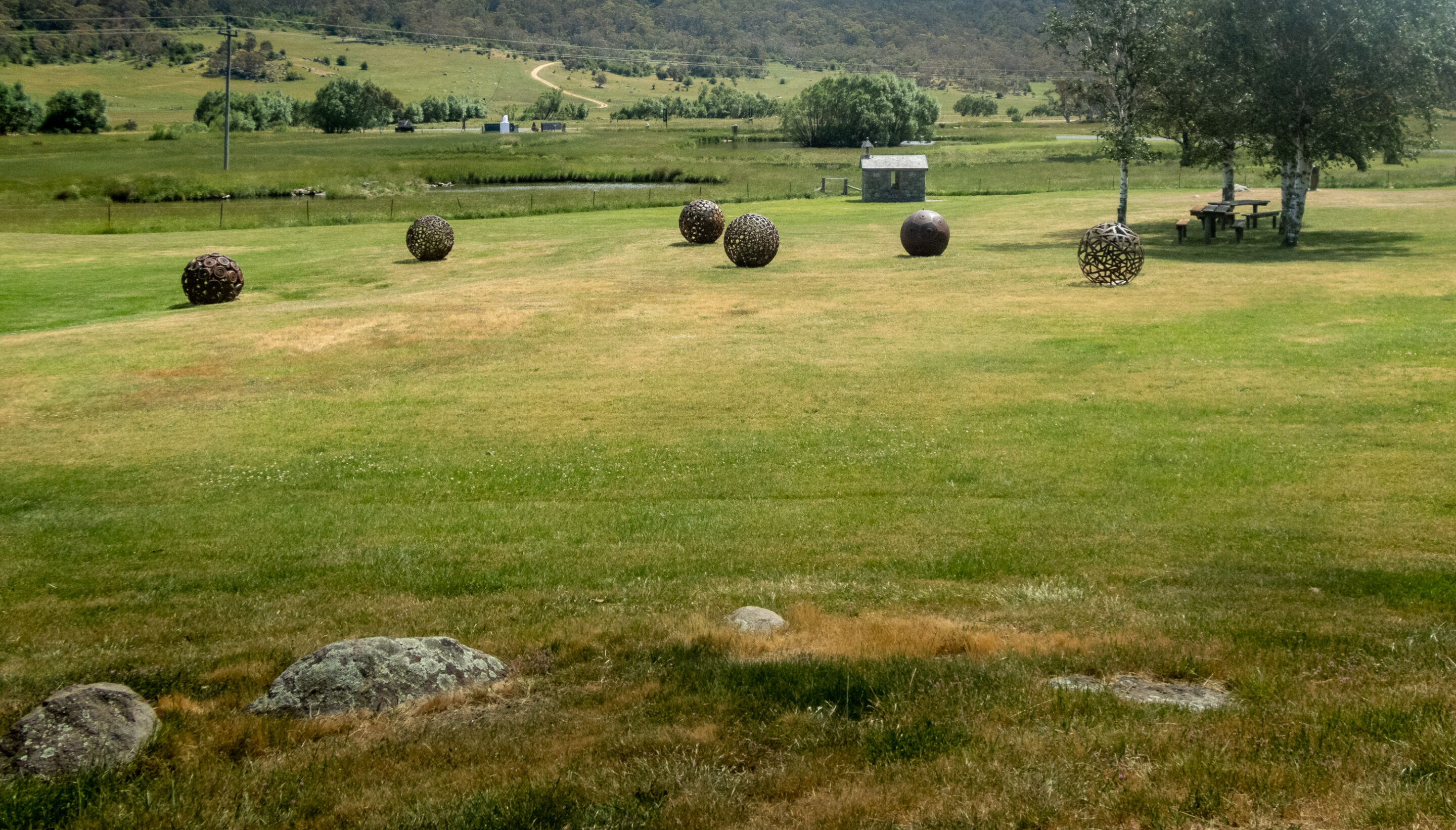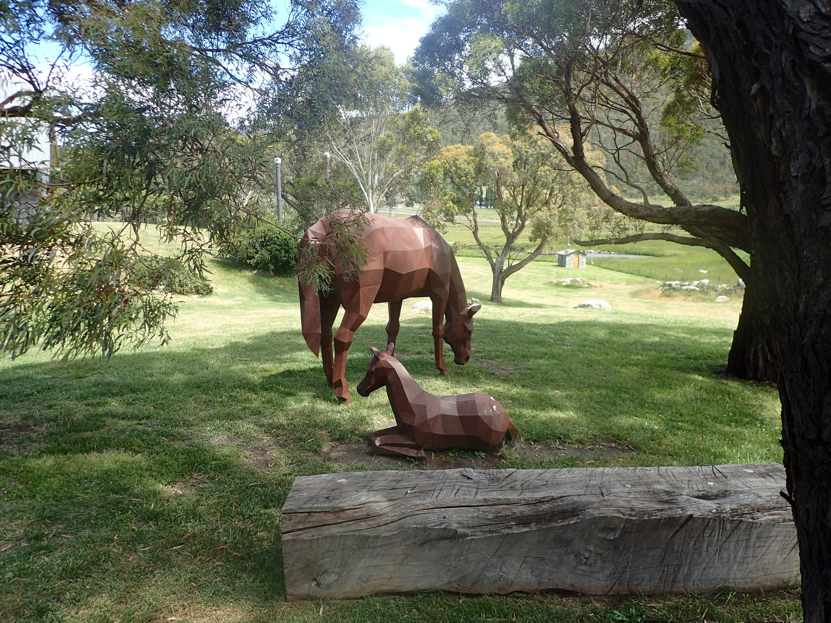 It was an 8.30am start from Williamsdale on the Monaro Highway. Blossom had broken down so Geoff was not able to join us. The convoy headed south to Cooma and on to Jindabyne with an opportunity to refuel. It was not far from Jindabyne before we stopped for morning tea at the Brumby Gin Distillery and Café. The coffee was good and the desserts luscious. The Café is set in gardens dotted the sculptures. The raspberry patch was extensive but unfortunately there was no fruit just yet. (It was also fully fenced and out-of-bounds.) We ate on the verandah with views across the garden with a cool breeze forcing us to don jumpers.