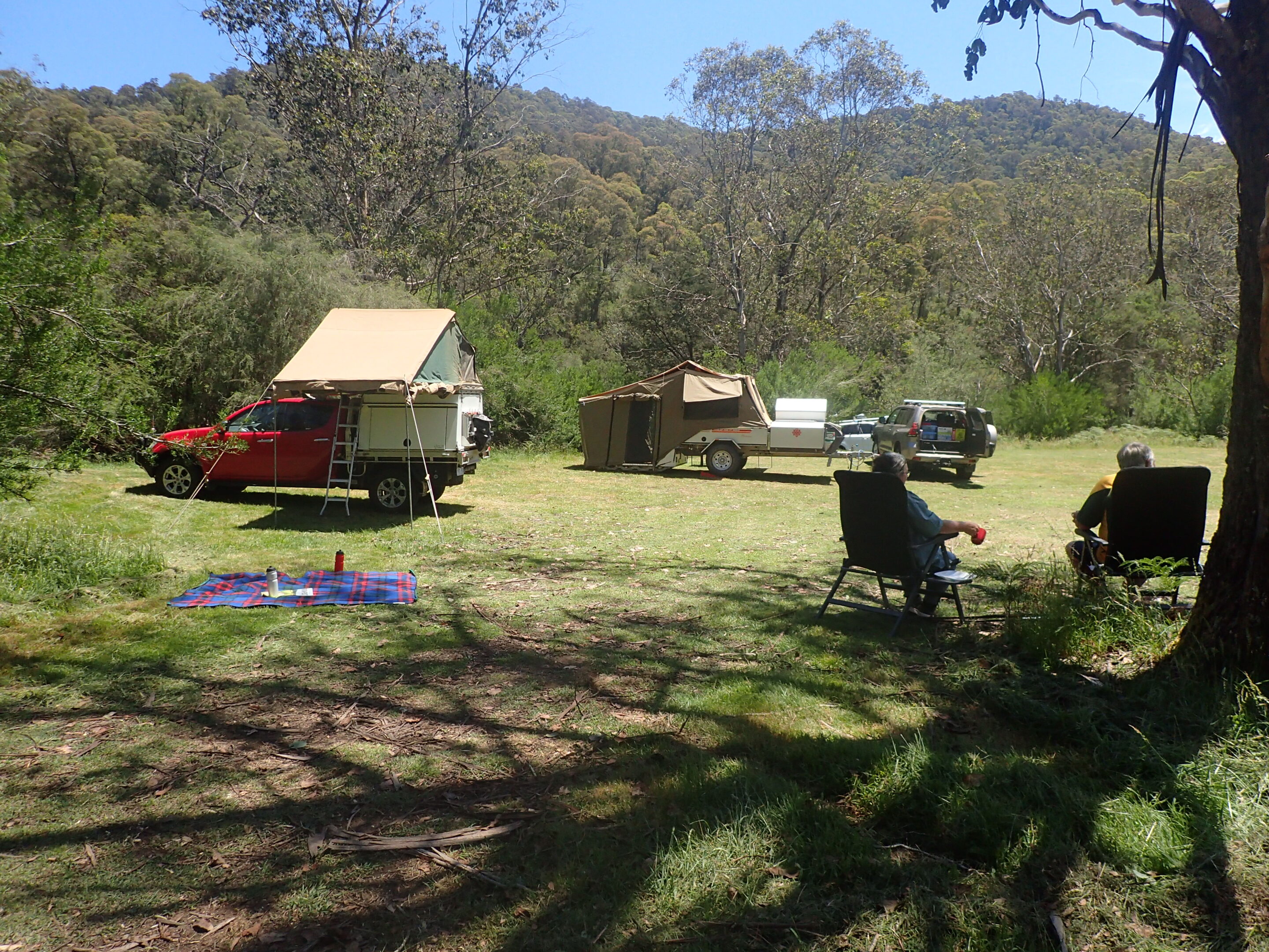Geehi is a large campsite beside the Swampy Plain River. The site was freshly mown with a number of clean long drop toilets. The steep peaks of the western Snowy Mountains and Mt Townsend rose above us.