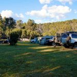 After 8km, we intersected with the Misery Trail which would take us to the 4 way intersection with McCarthy’s and Buckwong tracks, just south of Charlies Creek. We were looking forward to being in camp by about 3pm, but 5km shy of Charlies Creek we encountered a large tree, approx 1m in diameter, fallen across the track. There was no way to get around it and no chainsaw, which left our options to abandon getting to Charlie Creek to rendezvous with Paul and backtrack to Native Dog Flat for the night, or move the tree. Luckily Ron’s brand new Landcruiser was fitted with a brand new winch and between us we had a saw to remove all the saplings from around the root system of the tree, chains and a winch block pulley. Hoppy sawed down trees and Ron, Paul and Kevin set up the chains around the tree and the winch cable, while Jo sat in the Landcruiser, foot firmly on the brake. Masterfully, Ron gradually winched the tree forward, changing the angle of the cable and block a couple of times until the tree was clear of the track. The tree removal held us up for about an hour but we arrived at Charlies Creek camp at about 4pm with no other campers (or Paul) in sight, and the place to ourselves. Three of us set up tents, Kevin opened the back door of his pod camper, while Ron and Jo set up their new stretchers and swags under the awning of their car.