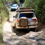 Once we turned onto Dapples Creek track, the drive became more challenging and low range was required, with some steep sections, ruts and loose rocks. Sue lost traction on a steep section which had some deep ‘moguls’, but after reversing a short distance and engaging the FJ’s rear diff locker got through with no difficulty. Kevin got hung up on the same section, but by taking a different line and with some more momentum got safely through, as did the rest of the convoy. This was the first ‘bush’ outing for Ron and Jo’s new 200 series Landcruiser, so Ron was busy trying out which buttons to press to get him up the steep bits.