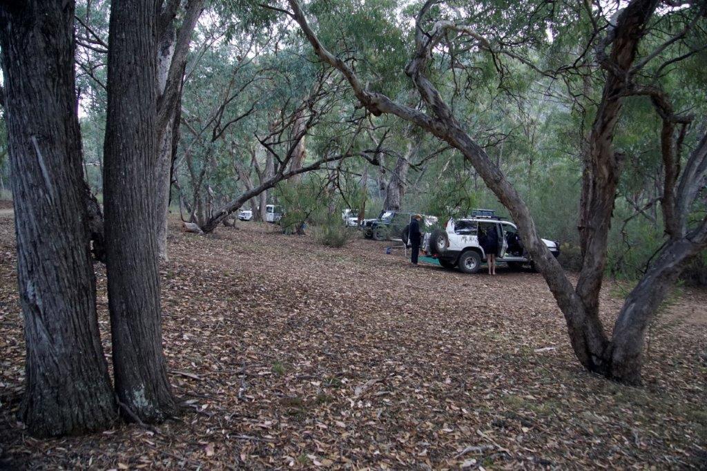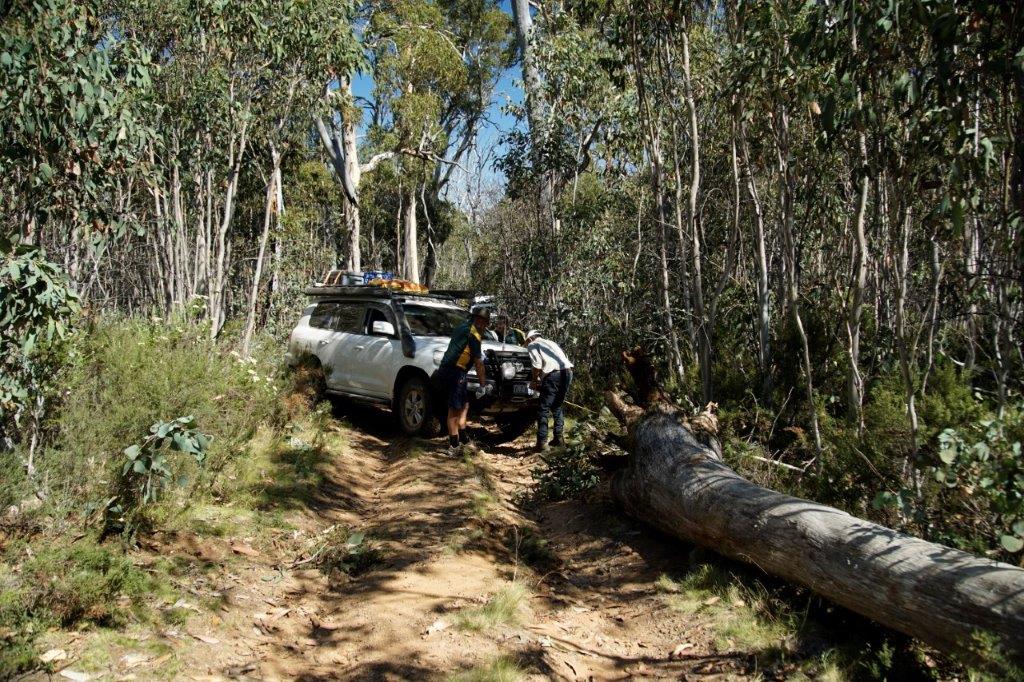 After 8km, we intersected with the Misery Trail which would take us to the 4 way intersection with McCarthy’s and Buckwong tracks, just south of Charlies Creek. We were looking forward to being in camp by about 3pm, but 5km shy of Charlies Creek we encountered a large tree, approx 1m in diameter, fallen across the track. There was no way to get around it and no chainsaw, which left our options to abandon getting to Charlie Creek to rendezvous with Paul and backtrack to Native Dog Flat for the night, or move the tree. Luckily Ron’s brand new Landcruiser was fitted with a brand new winch and between us we had a saw to remove all the saplings from around the root system of the tree, chains and a winch block pulley. Hoppy sawed down trees and Ron, Paul and Kevin set up the chains around the tree and the winch cable, while Jo sat in the Landcruiser, foot firmly on the brake. Masterfully, Ron gradually winched the tree forward, changing the angle of the cable and block a couple of times until the tree was clear of the track. The tree removal held us up for about an hour but we arrived at Charlies Creek camp at about 4pm with no other campers (or Paul) in sight, and the place to ourselves. Three of us set up tents, Kevin opened the back door of his pod camper, while Ron and Jo set up their new stretchers and swags under the awning of their car.