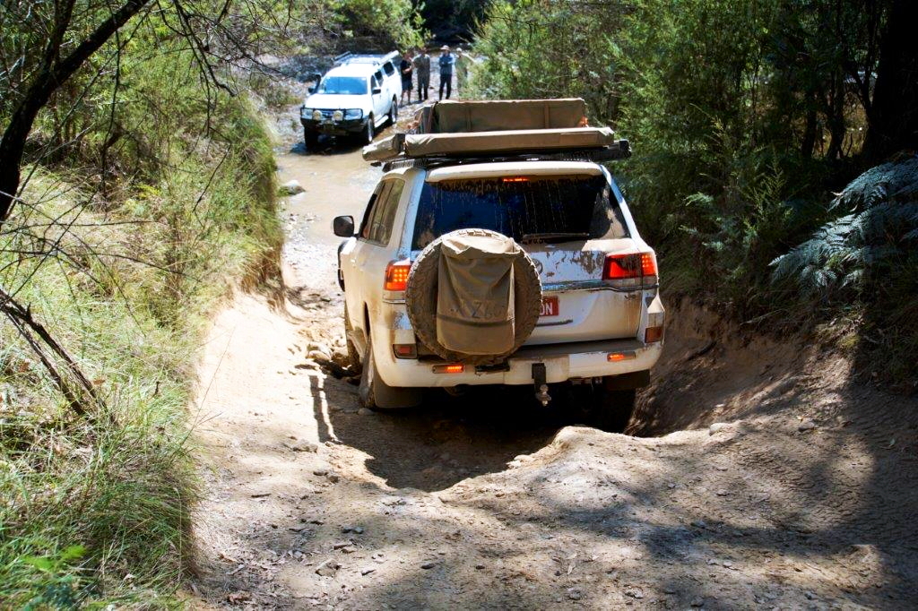 Once we turned onto Dapples Creek track, the drive became more challenging and low range was required, with some steep sections, ruts and loose rocks. Sue lost traction on a steep section which had some deep ‘moguls’, but after reversing a short distance and engaging the FJ’s rear diff locker got through with no difficulty. Kevin got hung up on the same section, but by taking a different line and with some more momentum got safely through, as did the rest of the convoy. This was the first ‘bush’ outing for Ron and Jo’s new 200 series Landcruiser, so Ron was busy trying out which buttons to press to get him up the steep bits.