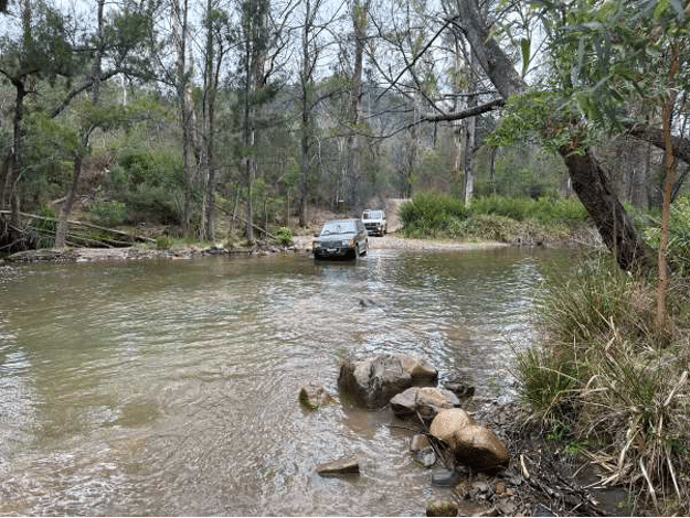 Some way along the convoy came to a halt. There was a tree down across the road. Simon and Craig got out their blunt axes and dealt with it in short time. We carried on but soon stopped again. Another tree. Quite small this time and it was cleared before the entire party had stopped. The next obstacle was the Deua River. It wasn’t deep, so it didn’t slow us down.