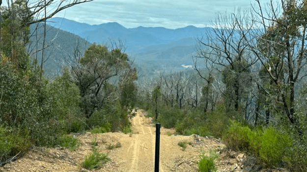 At a convenient spot not far from a trig point that looked like it was destroyed in the 2019 fires we stopped for lunch. Simon confirmed that the ABS sensor was disconnected from the wires. Probably due to sticks. Thankfully, the rain had abated to just mist. Simon assured us that the views were splendid, all the way to the ocean. We could see maybe 50 metres so we had to accept his word.