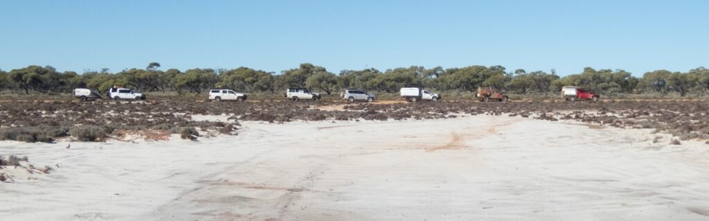 The further north we travelled the higher the sand dunes became, with the first large dune causing us all a few problems. Nevertheless it didn’t take us long to get the hang of dune driving. Passing Goog’s monuments we headed easterly off the track 4km to Goog’s Lake. This was our first campsite on the track. The group explored the lake surrounds, wildflowers, and walked the salt lake surface. The night was freezing after a warm day.
