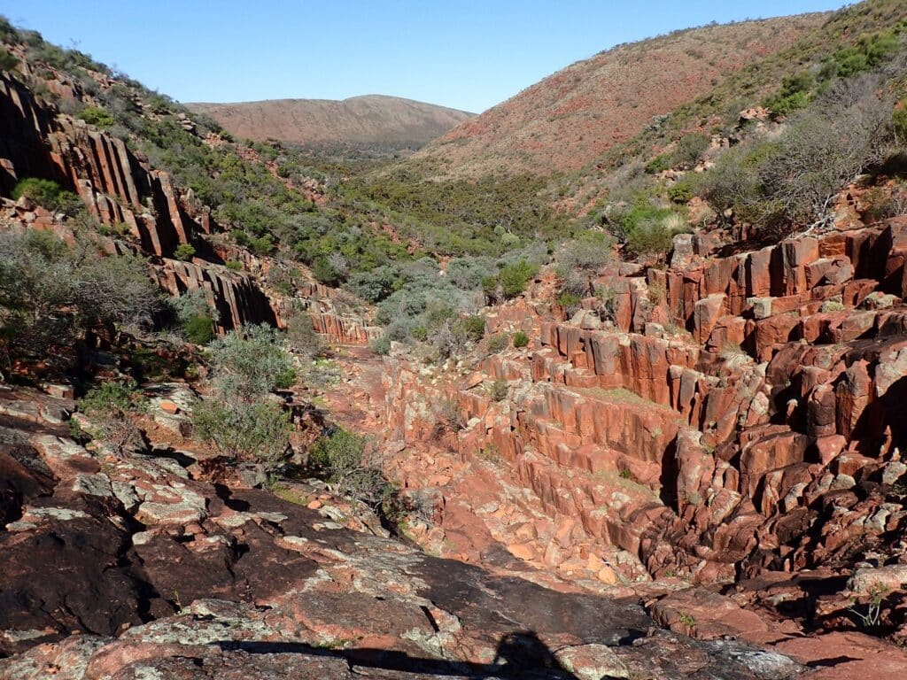 We journeyed south through the park to the Organ Pipes. There is a short walk through gums which opens up to a mass of octagonal rock formations through which a creek would flow after rain. The scene is spectacular and we spent some time exploring the hillsides and creek. Returning north we set up camp at the spacious Scrubby Peak campground nestled amongst the mallee trees.