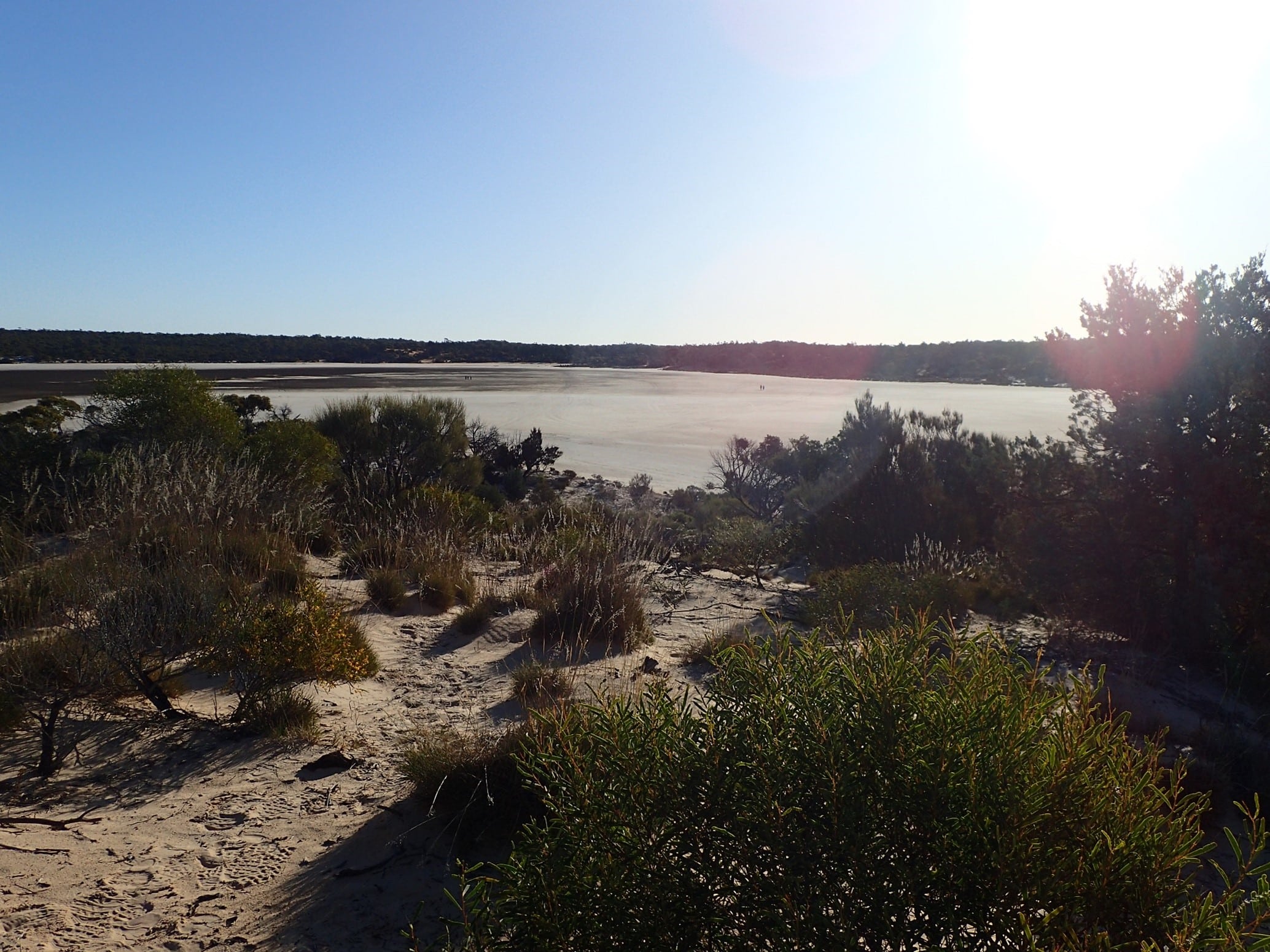 We journeyed south through the park to the Organ Pipes. There is a short walk through gums which opens up to a mass of octagonal rock formations through which a creek would flow after rain. The scene is spectacular and we spent some time exploring the hillsides and creek. Returning north we set up camp at the spacious Scrubby Peak campground nestled amongst the mallee trees.