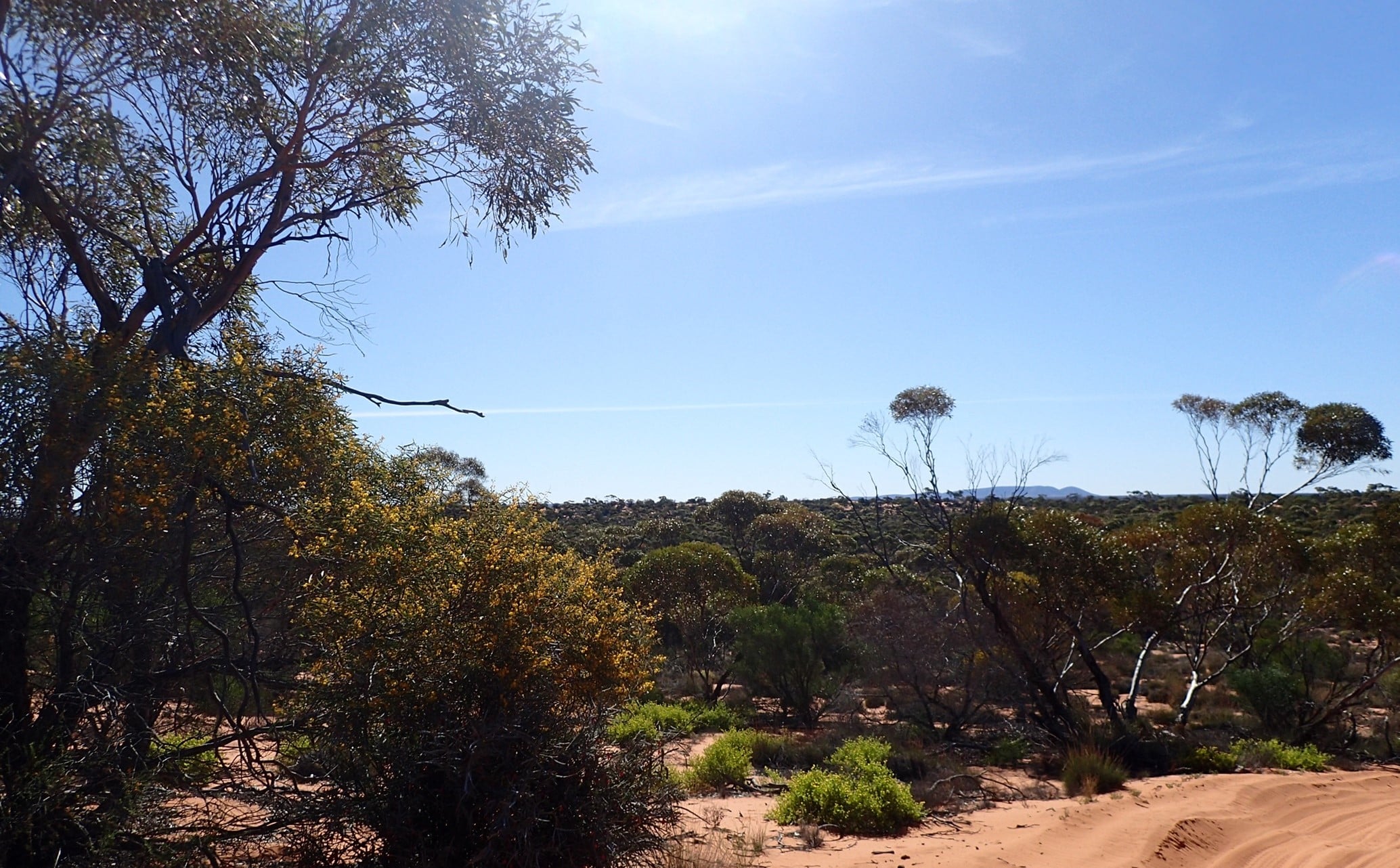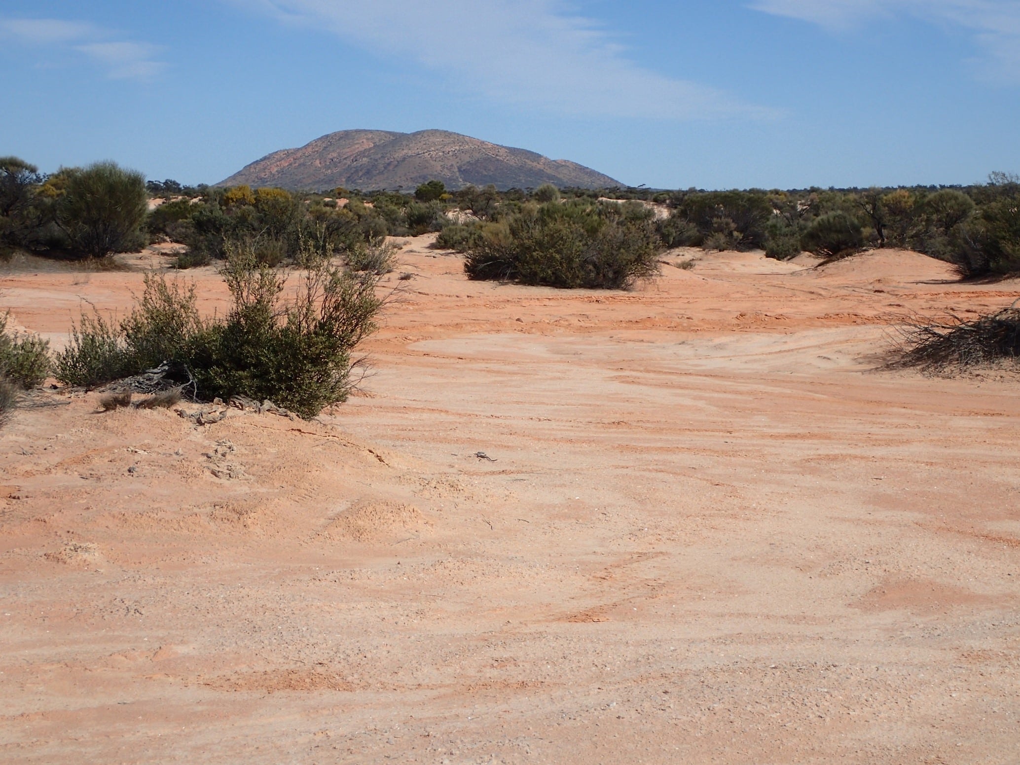 The sand dunes were becoming higher and softer but glimpses of Mt Finke could be seen on the crests of the highest dunes, giving us something to aim for. Larger gum trees appeared amongst the scrub. It was around 3.00pm when we made camp at Mt Finke approximately 6km west of the track. While the campground is large and flat, there are no facilities.