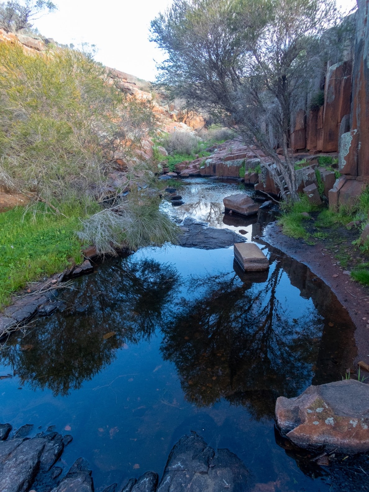 Early morning saw us return to Mirica Fall to complete the Fairview Walk. The walk follows the gully up the rockface providing views of the more immediate countryside. The healthy rockpools were home to tadpoles and water plants. To see the falls with water would be spectacular. Goats and emus watched our progress along the hill. Heading south our next stop was the shearing shed. The shed has been updated with information, a new floor, beams and roof. Outside of the shed we discovered the holding pens, sheep dip, and race – all so typical of an Australian woolshed.