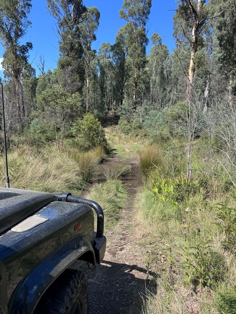 After lunch we followed the Snowy and started climbing toward the Cobberas. The long-closed entrance to Ingeegoodbee track which leads to McFarlane’s Track was noted on the way past. A short stop was held to inspect the Suggen Buggen school house after which we continued up the hill and turned right onto Limestone Road. A dingo was spotted by Mackenzie and Keaton at the front of the convoy.