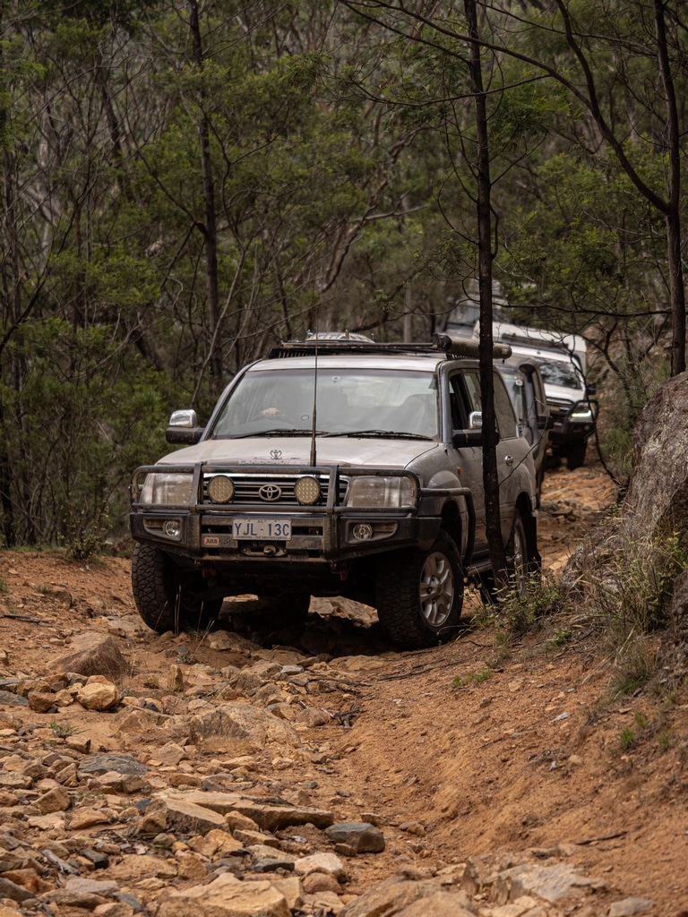 Morning broke with a visit from some Brumbies and we departed Native Dog on Limestone Road for Benambra and Omeo. Arriving at Omeo for morning tea we visited the local pie shop before heading off towards Cassilis and Tongio west. Just after turning off at Tongio West, we disturbed a few wedgetail eagles feasting on a dead emu which Jeremy captured on film. Heading west along Charlotte Spur track proved to be a little more challenging than the “easy” rating on Hema maps and your author’s recollection of it from a previous trip. One small recovery was all that was necessary however, and we stopped on the ridge near the former Brookville town site for lunch before pressing on past Strobridge’s huts to the top end of Haunted stream track.