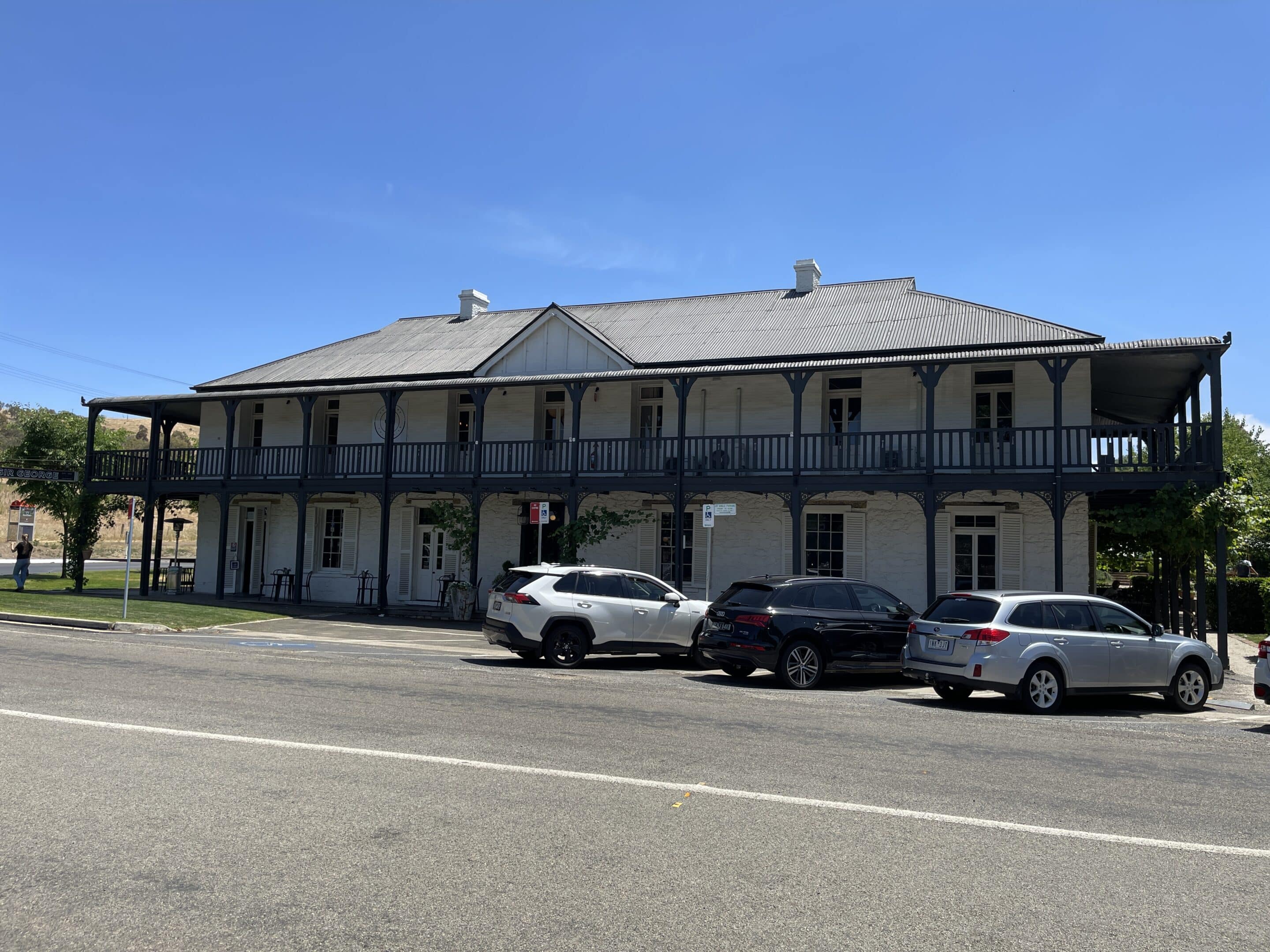 Our drive through the township of Yass was of interest to some who had not been through the town for some time. We slowly moved down the fairly busy main street, past the site of the Commercial Hotel, built in the 1840’s, ceased trading in about 2005, gutted by a suspicious fire in May 2023, and now demolished. We made our way through town and out to the long black stuff, that was the Hume Highway, for a quick drive down to the village of Jugiong.