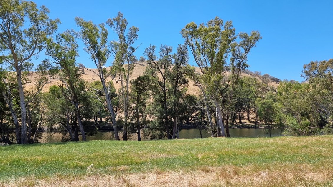 Following our leisurely lunch, around 1:30pm we bid Kevin and Karen farewell on their journey. We left Jugiong back up Riverside Drive, turning right onto Bundarbo Road and across the newly built bridge over the Murrumbidgee. We travelled along a short stretch of tar into open farmlands. The road slowly climbed a ridge to present a strange view of the Murrumbidgee on both the left and right sides of the road at the same time, as we travel through the neck of a loop in the river. It was not long before we hit the gravel.