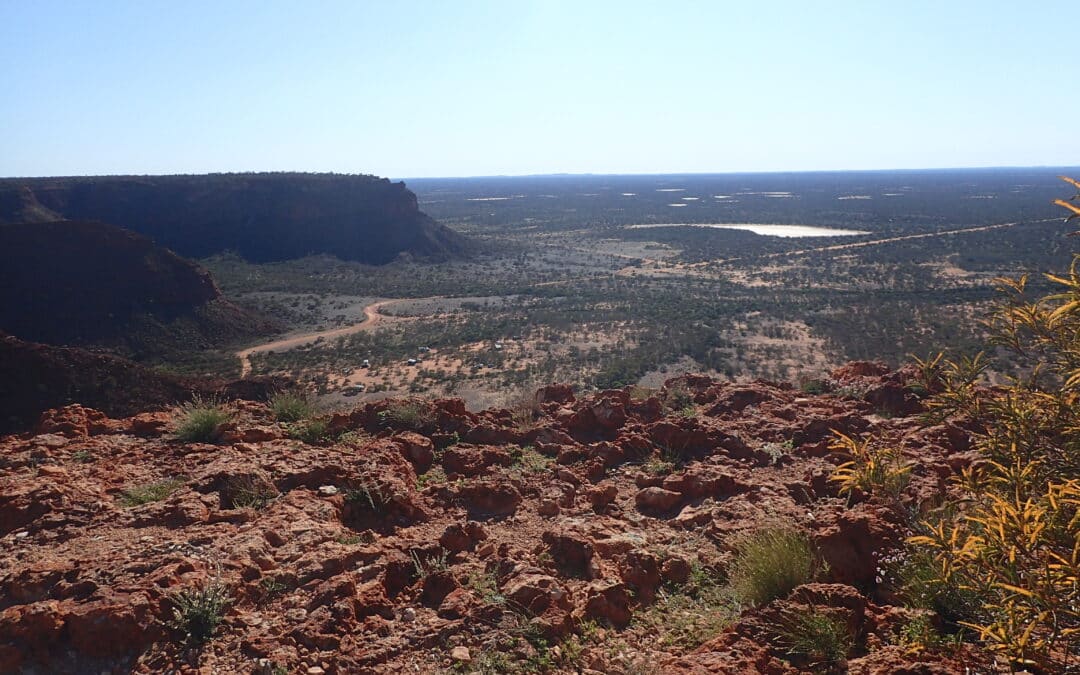 It was a relaxed start to Day 3 as we continued the slow and challenging drive south past a mesa knob, the dunes, the basin and Lake Julia. The scenery was always changing. Rock escarpment, dunes, desert red sand dunes, low shrubs, ex-farmland, and a clay, salt lake covered with masses of small pale pink flowers. The drive is slow with a twisting track, corrugations, jump ups and is single track only. We only met one vehicle.