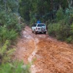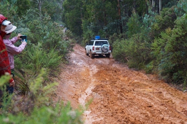 The weather was against us on Saturday with the rain turning the otherwise easy grade trip into a more adventurous medium grade with the need to engage 4 wheel drive. In a particularly interesting section on Bramina Road, one of our Disco 2s required recovery when it became stuck in the rutted, slippery red clay section of the track, due to a grounded diff. The rest of the group discovered it was best not to fight gravity and made their way safely through this section by sliding into the rut and carefully making their way to the bottom. The rest of this track, while slippery in places and causing a number of us to do a little dance, remained incident free. As a note, the owner of the grounded Discovery had persuaded his adult daughter to join him on her first every 4×4 trip but we don’t think she’s put off by the incident.