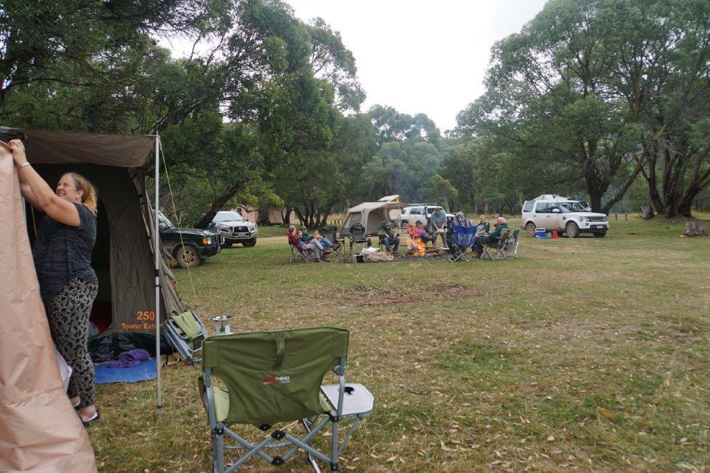 We continued our journey on to Long Plain Road to reach Long Plain Hut Campground in plenty off time to set up camp for the night. The rain had stopped. At least four groups were setting up new ‘tents’, so some head scratching and team discussion occurred (that’s one of the great thing about being in the club, there is always someone to lend a hand and share their experience). After setting up camp and getting the fire going, we enjoyed swapping stories, nibblies and socialising before breaking off to cook and eat our dinners. After dinner, we returned to the camp fire for more socialising and some wonderful port, supplied by Geoff Hill, before everyone eventually drifted off to bed for a well-earned rest.