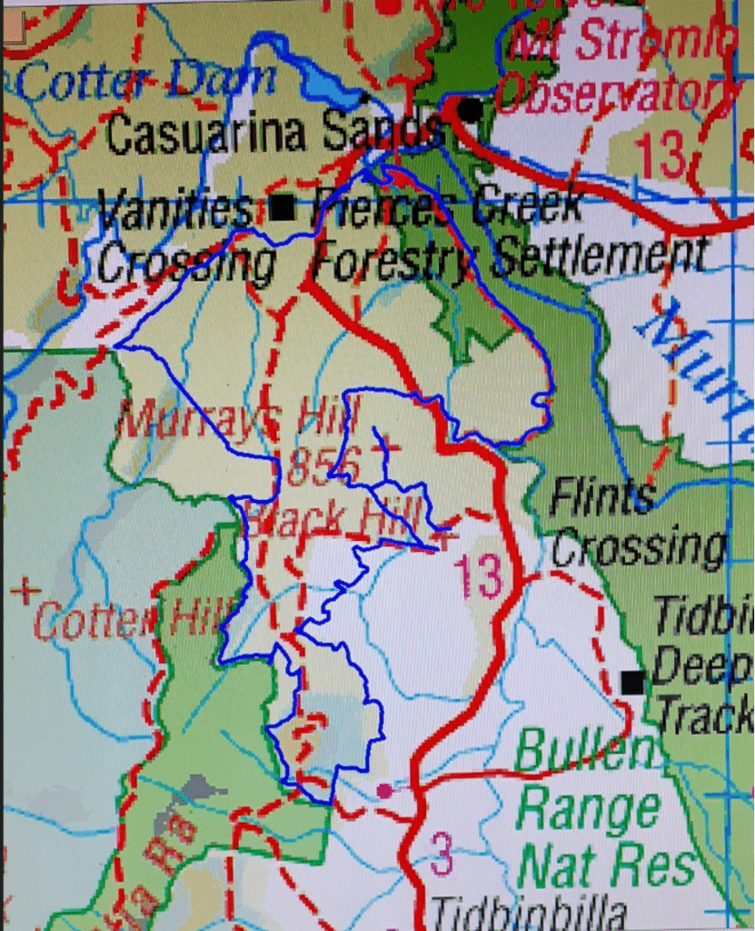 “Ok not all roads labelled, but after the Vanity Crossing Rd turn off we accessed Pipeline Rd then we came back to Laurel Camp Rd, then Tidbinbilla Range Rd, sth parallel with Oakey Ck Rd, sth then onto Oakey then along the property (Cong Warra) & Tidbinbilla reserve boundarys heading Nth up onto Black Hill for lunch, back past the mineshaft to Murrays Corner, across Bullen Range to Cotter.”