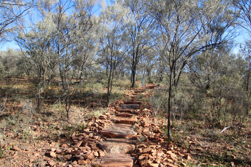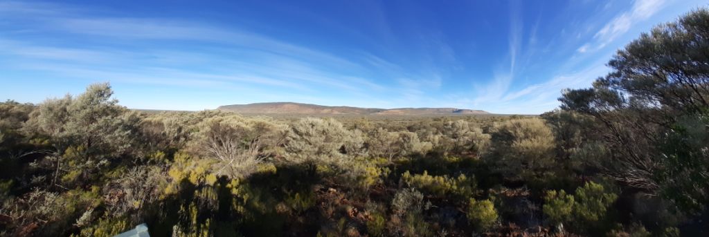 A beautiful crisp morning was spent adjusting camper trailer set-ups and taking the odd photo or two. Ann had booked us in for morning tea at 10:30am at $10 per head. We enjoyed fresh scones, jam and cream along with a selection of slices. Hot tea was served with these. At 12.30 we headed out to Gundabooka N.P. and State Conservation Area. Chris went with Eric as Paulette rested her healing foot. Some sections of the spoon drains were still full next to pavement on Louth Rd. We visited Yanda campground about 25km towards Bourke and 3 km in off the Louth road, on the Darling River. It has some basic facilities and includes a free BBQ. A heavy coating of black soil covered the grass towards the rivers edge making walking progress impossible. We then headed a small distance further north towards Bourke and took the Yanda track to the east. We parked at the Dry Tank camping area and started out on the Little Mtn walk (4.8km return) the walk was an easy stroll through the mulga and then a moderate slope up to Little Mtn. Beautifully constructed stone steps defined the steeper section. At the top, a lookout offered scenic views to Mt Gundabooka, about 5 km to the SW at 495m elevation. The trek to the top reserved for another trip. The walk took about 1.5hrs return. We drove back to Louth Rd via Ben Lomond Rd and Gundabooka Mulgaroon Rd, arriving at Rose Isle on dusk. T’was beverage o’clock again followed by meals at the camp kitchen’s fire place. A couple of field mice added to the entertainment later in the evening.