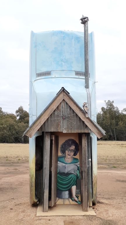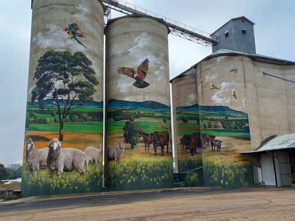 Due to low starting numbers the departure point was moved back to Hall where we headed off at a leisurely 10am. Travelling via the Lachlan Valley Way and turning off before Boorowa we headed west via Young for a first stop at Grenfell. After first taking in the beautifully painted silos on our route into town we then found RV suitable parking as near the main street as possible to facilitate Paulette’s impaired mobility due to recent foot surgery. Mikes Bakery with tables, local pies and coffees fitted the bill.