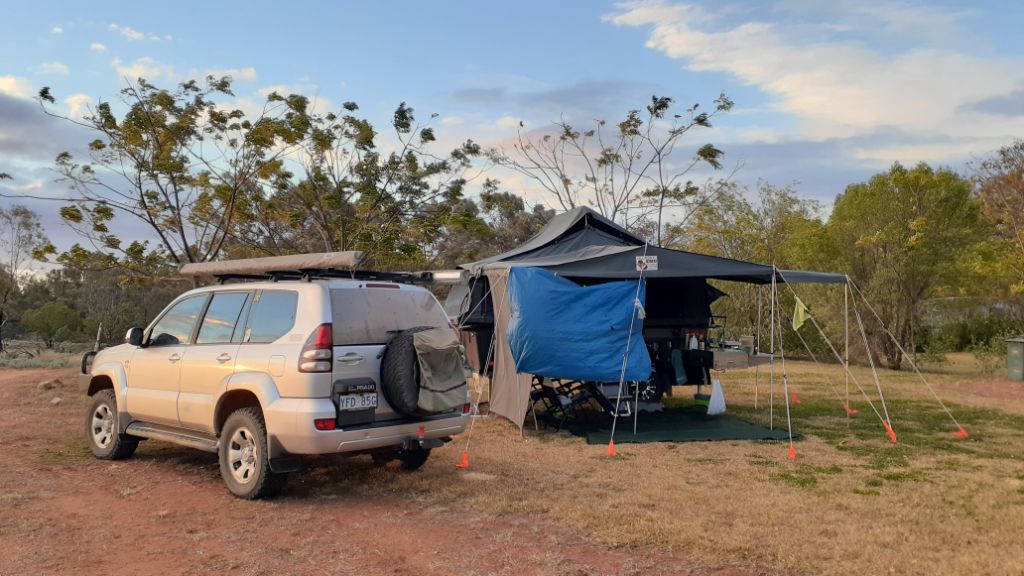 We delayed morning pack up as long as practical to allow some drying of canvas due to heavy dew. We departed around 10am, heading via Nyngan, Bourke toward Louth. We had a morning tea stop at Tottenham (centre of NSW) (interested to see an Action bus parked in a side street?), cake and coffees yum.