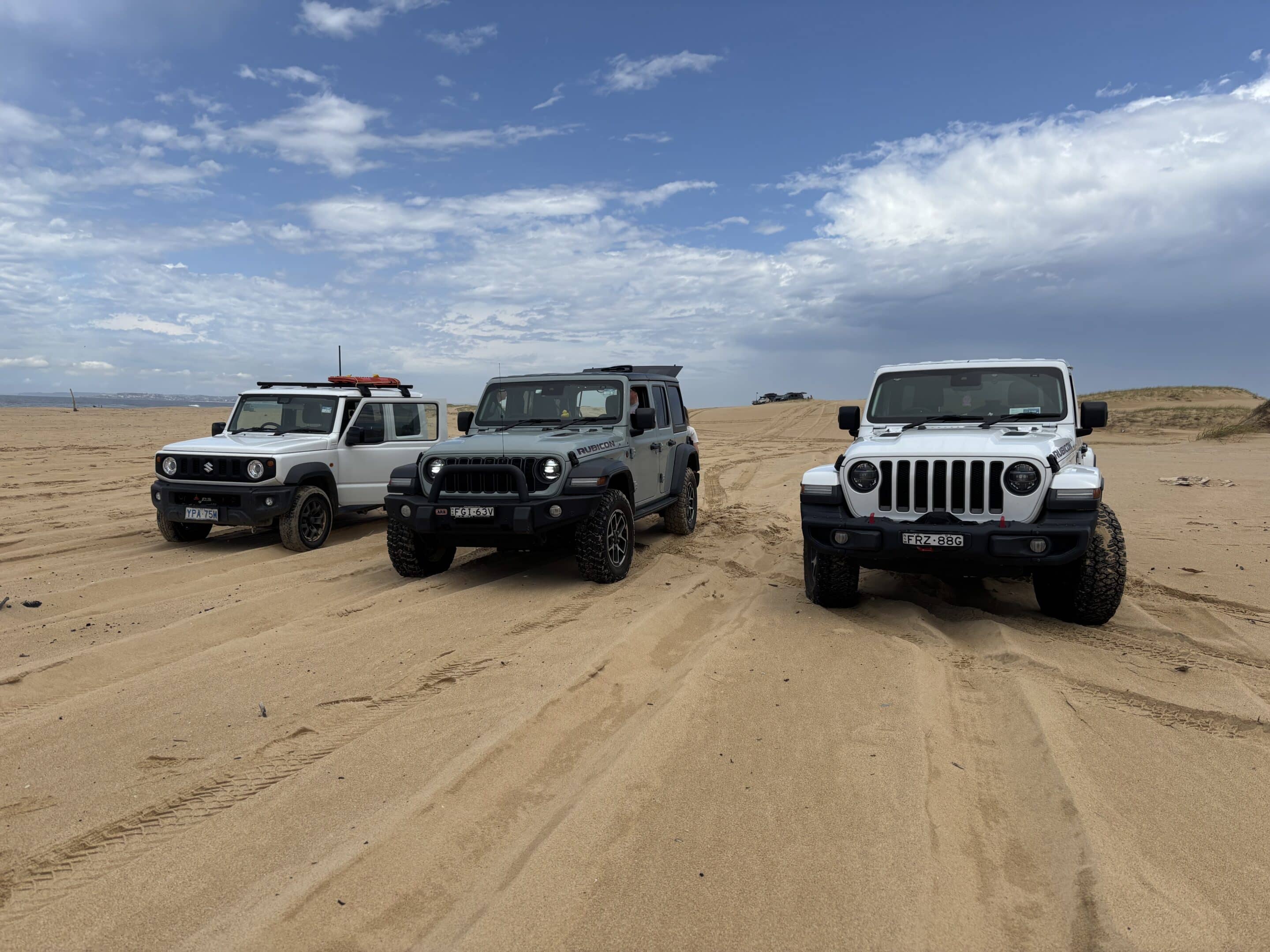 Following the fence line, we headed inland to explore the 350 hectares of sand dunes that are able to be driven on, the two jeeps made it up the dunes with no problems, however we discovered that 20 PSI was too much pressure in the rear tyres of the Jimny which didn’t quite make it up. Some adjustments to the air pressure made a significant difference and David said that the vehicle was transformed on the sand. David also discovered that in high range the traction control button doesn’t do what it says it does with traction control repeatedly turning itself back on. David rectified this by selecting low range which made the traction control behave itself. Following a drive around the dunes we had some lunch and headed north back to Anna Bay.